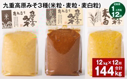 - 【1ヶ月毎12回定期便】 九重高原みそ 3種 (米粒・麦粒・麦白粒) 計144kg(12kg✕12回) 味噌 みそ