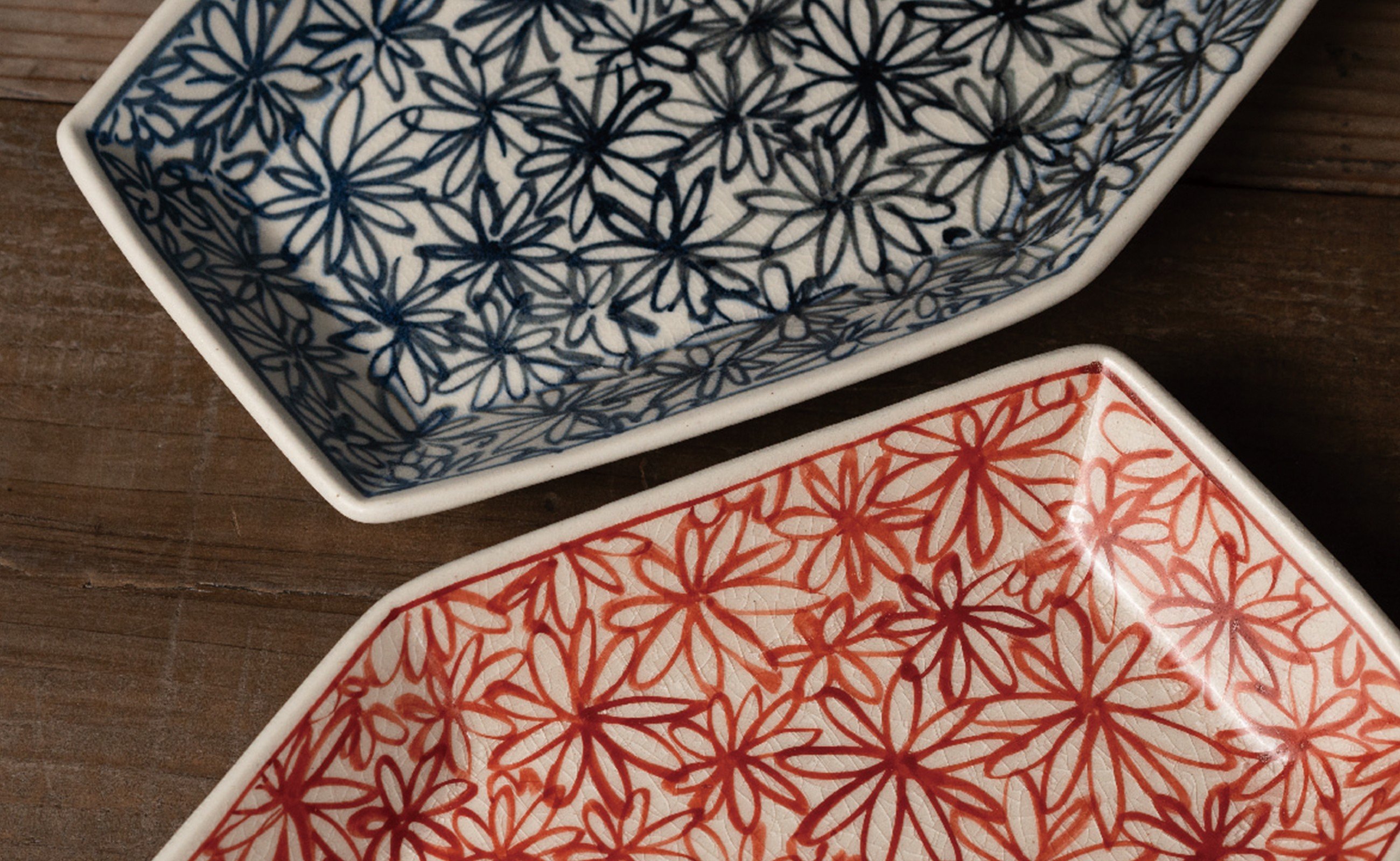 - 【セット】 有田焼 手描き 染付 花詰 たたら六角 中皿 2枚セット (赤・青) 喜鶴製陶