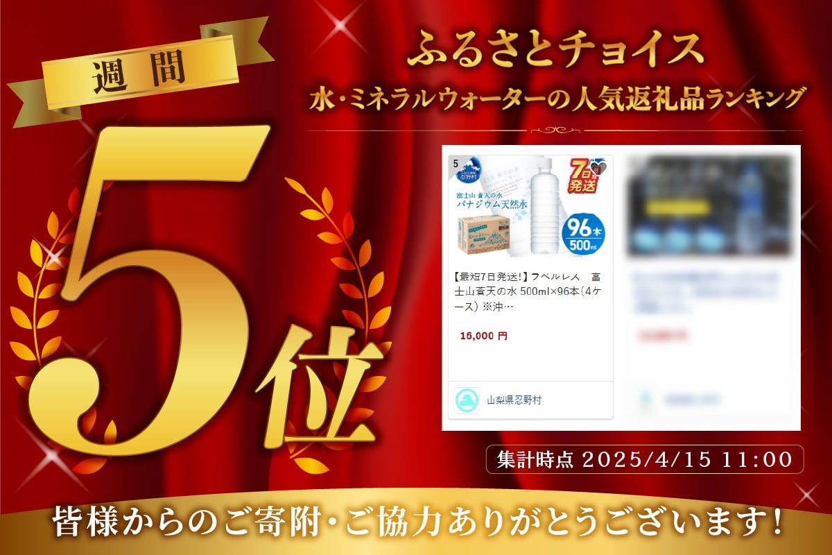 - 【最短7日発送!】 ラベルレス 富士山蒼天の水 500ml×96本(4ケース) ※沖縄県、離島不可 天然水 ミネラルウォーター 水 ペットボトル 500ml バナジウム天然水 飲料水 軟水 鉱水 国産 シリカ ミネラル 美容 備蓄 防災 長期保存 富士山 山梨県 忍野村