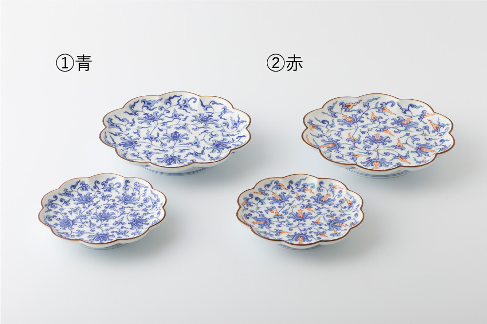 【セット】有田焼 染錦花唐草文輪花皿 大小2枚 (青/赤から選べる) 辻精磁社