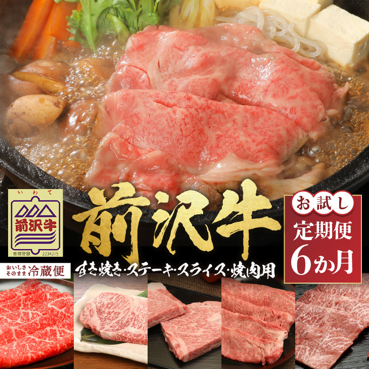 - 前沢牛 定期便 全6回 お試し6カ月コース モモ肉 すき焼き サーロイン ステーキ 切り落としスライス リブロース ロース ミスジ 焼肉 牛肉 ブランド牛 冷蔵便 離島配送不可 [U0083]