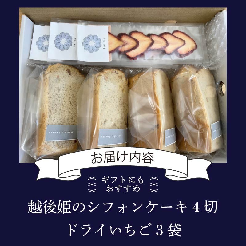シフォンケーキ 4切れ ドライいちご 3袋 セット 越後姫 苺 いちご イチゴ ケーキ 人気 いちごピューレ 母の日 父の日 おつまみ おやつ お菓子 洋菓子 冷蔵 国産 スライス 小分け 越後姫 フルーツ 果物 ドライ ドライフルーツ 贈答 プレゼント ギフト 贈り物 ichirin006