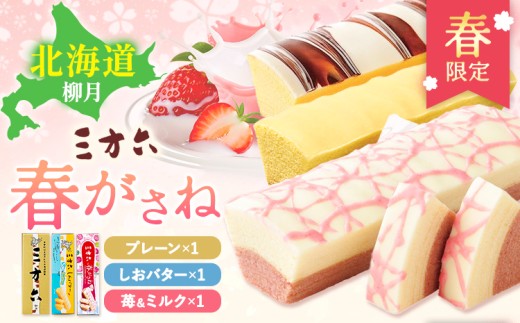 十勝スイーツ 柳月「三方六」詰合せ 春がさね( さわやか 苺 & ミルクリッチ )セット プレーン 塩バター 計3本 本別町観光協会 《30日以内に出荷予定(土日祝除く)》 北海道 本別町 十勝 セット バウムクーヘン バームクーヘン スイーツ 贈り物 ギフト