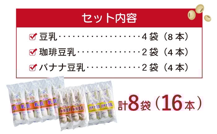 佐世保豆乳3種<プレーン・バナナ・コーヒー>飲み比べセット 合計16本(2本×8袋)【大屋食品工業】 [OAB068] / 豆乳 甘い アイス ジュース コーヒー とうにゅう 豆乳
