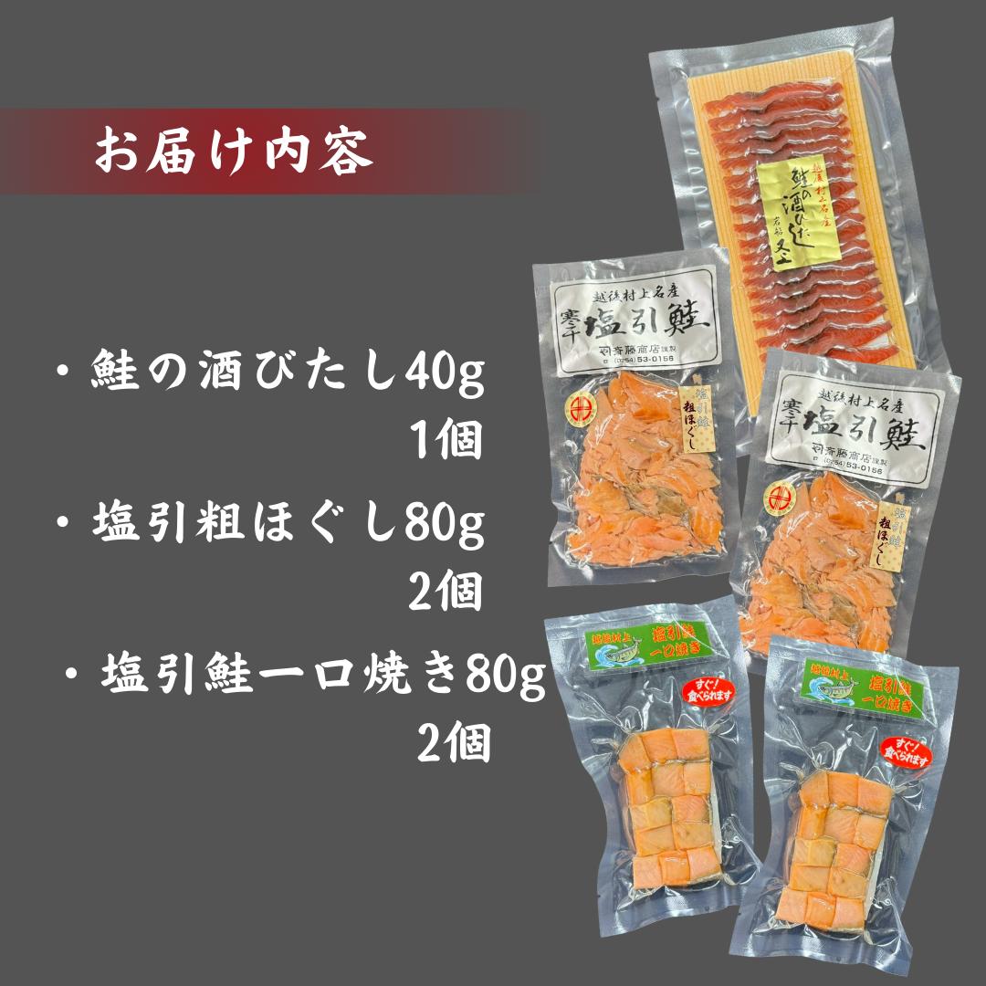 【訳あり】【数量限定】越後村上 贅沢鮭3種セット(鮭の酒びたし・塩引き粗ほぐし・塩引鮭一口焼き)1046007