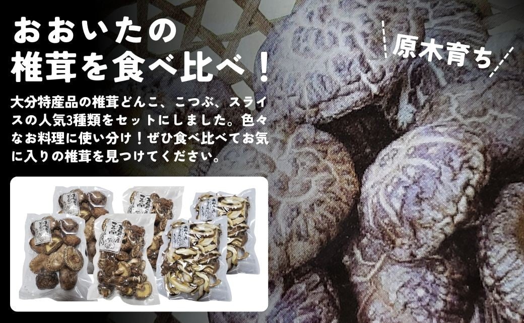 乾燥椎茸(しいたけ) 干しシイタケ(どんこ椎茸100g×2、こつぶ椎茸80g×2、スライス椎茸60g×2) 原木栽培 | 原木しいたけ 干し椎茸 しいたけステーキ シイタケ 干椎茸 菌床しいたけ きのこ ギフト 国産 産地直送 豊後高田市