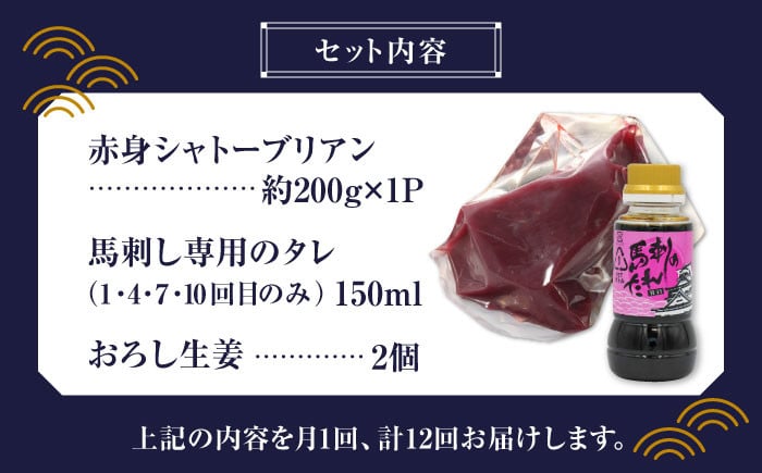 【12回定期便】【純国産】馬肉 赤身 シャトーブリアン 約 200g タレ付 国産 馬刺し ヒレ 馬肉 ヘルシー 専用タレ付き 小分け おろし生姜 低カロリー 高タンパク 冷蔵 真空パック ギフト 贈答用 おつまみ 熊本 山鹿市【有限会社 九州食肉産業】[ZDQ031]
