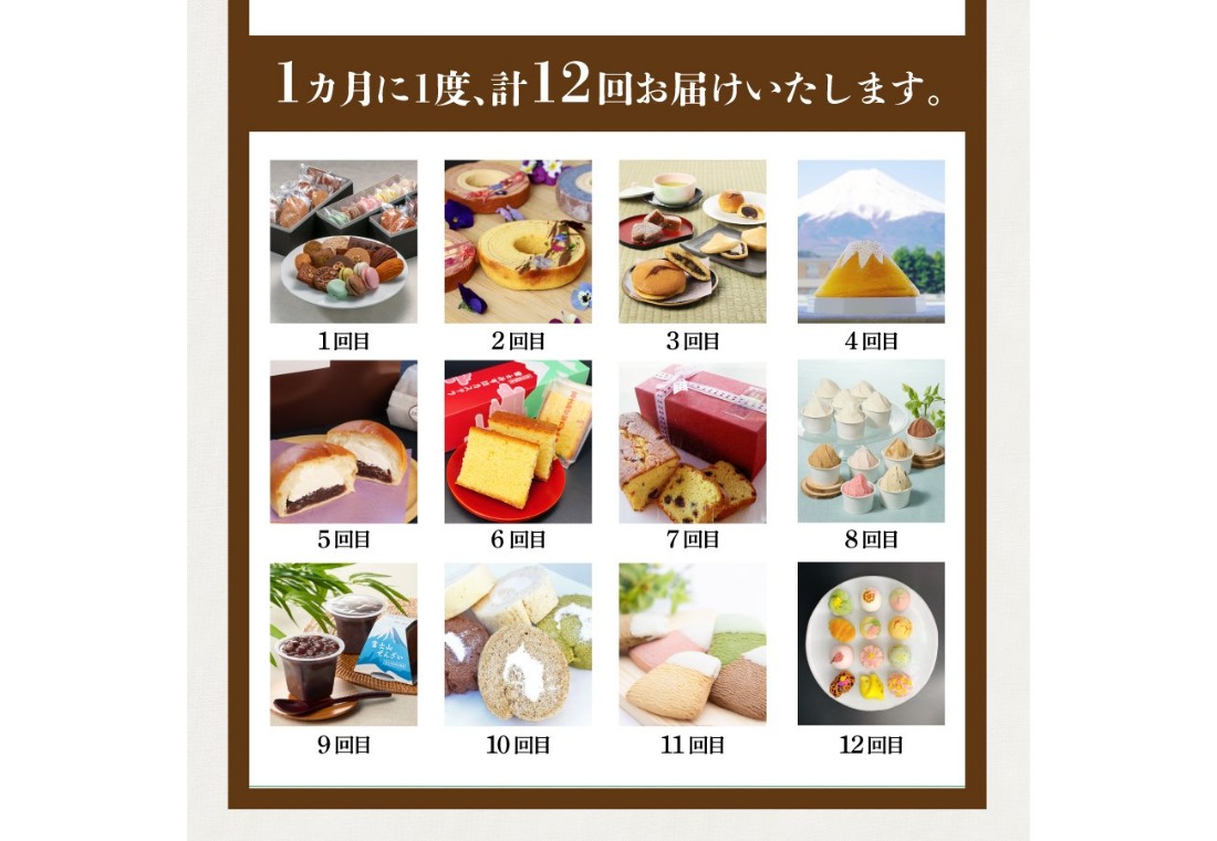 - 【12回お届け】富士吉田 スイーツまるごと定期便 お菓子 デザート バームクーヘン シフォンケーキ ロールケーキ 和菓子 あん生クリームパン ジェラート 詰め合わせ セット 食べ比べ 山梨 富士吉田
