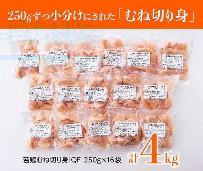 - 宮崎県産若鶏ムネ切身IQF 4kg (250g×16袋) 肉 鶏 鶏肉
