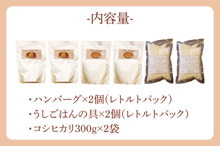 - BX004 雨情の里牛ハンバーグ・うしごはんの具・コシヒカリのセット