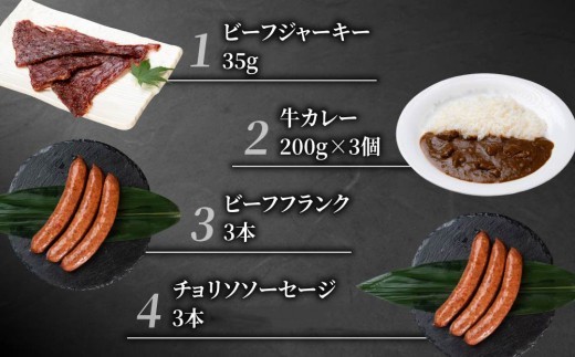 - 【信州プレミアム牛】ビーフジャーキー・ソーセージ2種(ビーフフランク・チョリソー)・ビーフカレーセット|牧舎みねむら ※着日指定不可