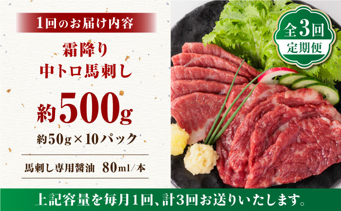 【全3回定期便】【熊本肥育】熊本ならでは!霜降り馬刺しをたっぷり楽しむセット ( 霜降り中トロ馬刺し 約50g×10パック ) 計500g 国内肥育 熊本 馬刺し 専用醤油付き 霜降り 中トロ サシ ばさし バサシ 馬刺 山鹿市 おつまみ 小分け【株式会社 利他フーズ】 [ZBK035]
