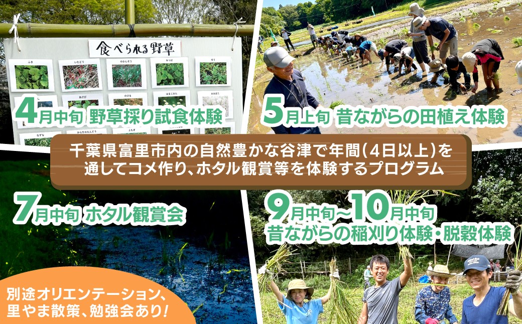 - 自然あふれる里やまで "里楽's(リラックス)しよう!" 体験プロブラム 年間パッケージ / TMAC001 体験 里やま 野草採り 田植え体験 田植え ホタル観賞会 ホタル 稲刈り体験 稲刈り 谷津 自然
