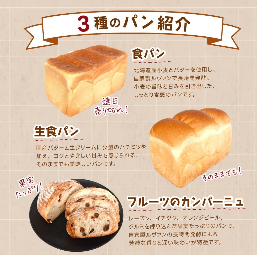 行列ができるパン屋さん!元ホテルシェフが作る3種のパン 食パン:生食パン:フルーツのカンパーニュをお届け! 【注文確定後約20日で発送】/ 和歌山県 かつらぎ町 パン ぱん 食パン ふんわり 職人【BK-kgr045】