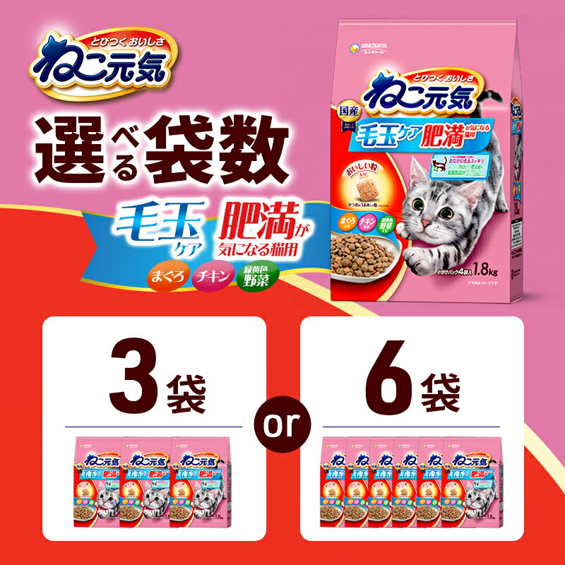 - 【ふるさと納税】ねこ元気 毛玉ケア 肥満が気になる猫用 まぐろ・チキン・緑黄色野菜入り 1.8kg 選べる袋数(3袋/6袋) ペットフード キャットフード 猫のごはん 猫用フード 猫 ペット ドライ ユニ・チャーム ペット