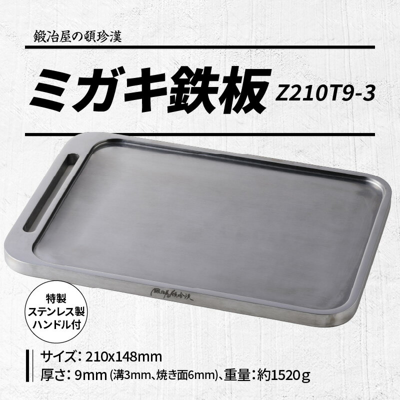 - 【ふるさと納税】ミガキ鉄板 210x148mm ハンドル付き 鍛冶屋の頓珍漢 Z210T9-3 厚さ9mm 溝3mm 焼き面6mm 約1520g キャンプ用 A5サイズ 収納 溝加工 液ダレ防止 焚き火 バーナー 簡易包装 エコ 株式会社セイコー 愛知県 小牧市 送料無料