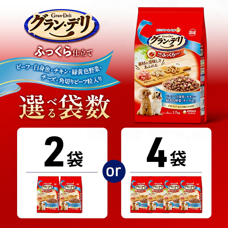 【ふるさと納税】グラン・デリ ふっくら仕立て ビーフ・白身魚・チキン・緑黄色野菜・チーズ・角切りビーフ粒入り 1.7kg 選べる袋数(2袋/4袋) ペットフード ドッグフード 犬用フード 犬 ペット ソフト ユニ・チャーム ペット