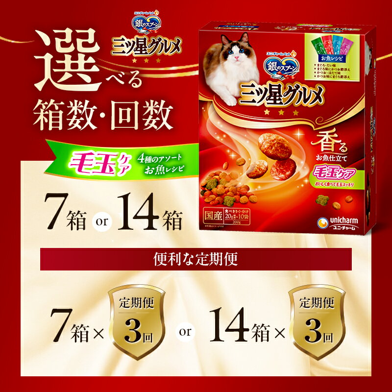 - 【ふるさと納税】銀のスプーン三ツ星グルメ 香るお魚仕立て毛玉ケア4種のアソート お魚レシピ 200g 選べる箱数・回数(7箱/14箱/1回/3回定期便) ペットフード キャットフード 猫のごはん 猫用フード 猫 ペット 小分け 個包装 ドライ ユニ・チャーム ペット