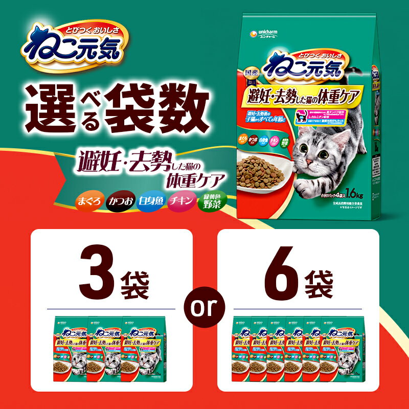 - 【ふるさと納税】ねこ元気 避妊・去勢した猫の体重ケア まぐろ・かつお・白身魚・チキン・緑黄色野菜入り 1.6kg 選べる袋数(3袋/6袋) ペットフード キャットフード 猫のごはん 猫用フード 猫 ペット ドライ ユニ・チャーム ペット