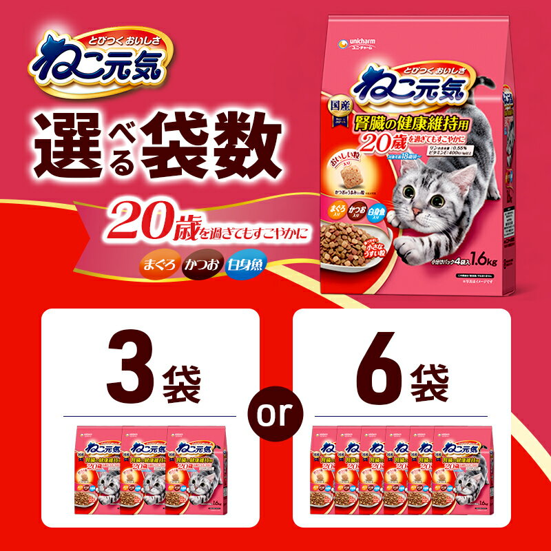 【ふるさと納税】ねこ元気 20歳を過ぎてもすこやかに まぐろ・かつお・白身魚入り 1.6kg 選べる袋数(3袋/6袋) ペットフード キャットフード 猫のごはん 猫用フード 猫 ペット ドライ ユニ・チャーム ペット