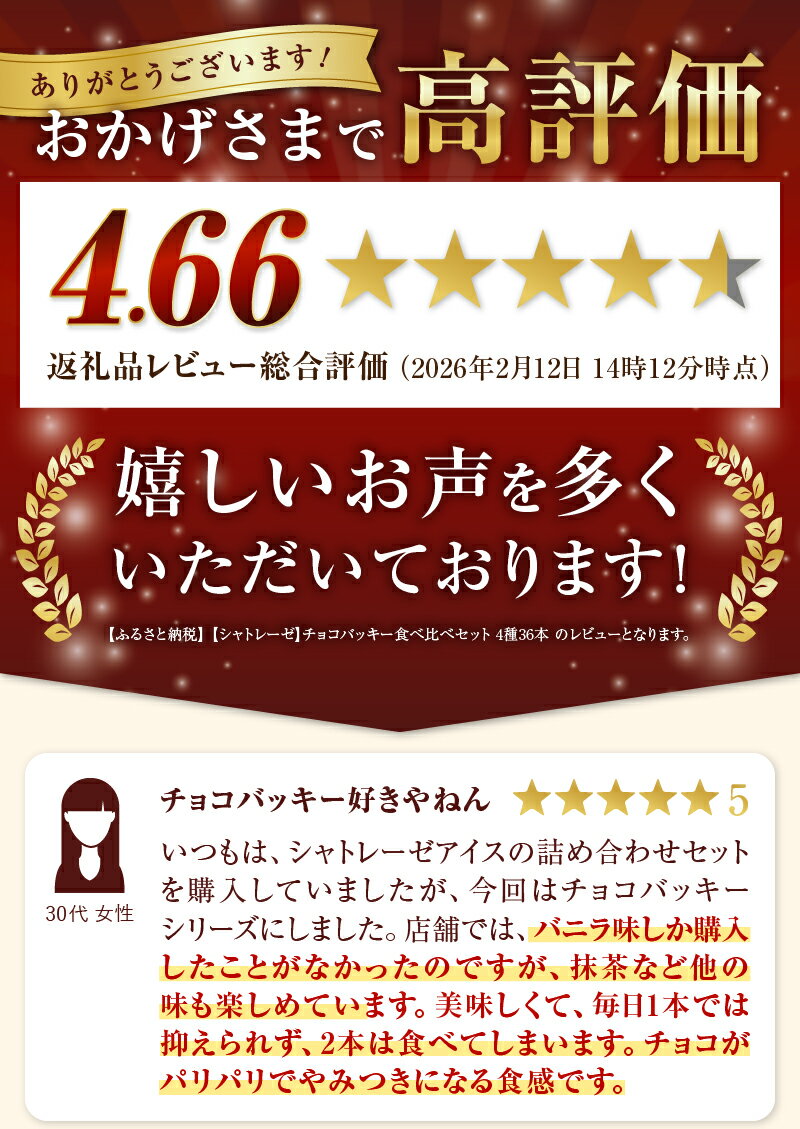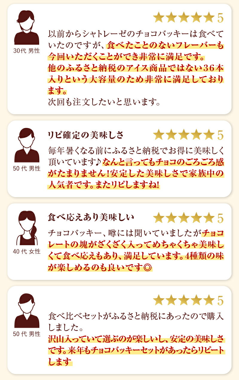 - 【ふるさと納税】 季節限定! シャトレーゼ アイス チョコバッキー 食べ比べ セット 4種 36本入り アイスクリーム 有名店 バニラ チョコ あまおう 苺 カジゴン おすすめ 人気 アイスバー スイーツ 贈り物 ギフト 山梨県 北杜市 15000円 以内 h028
