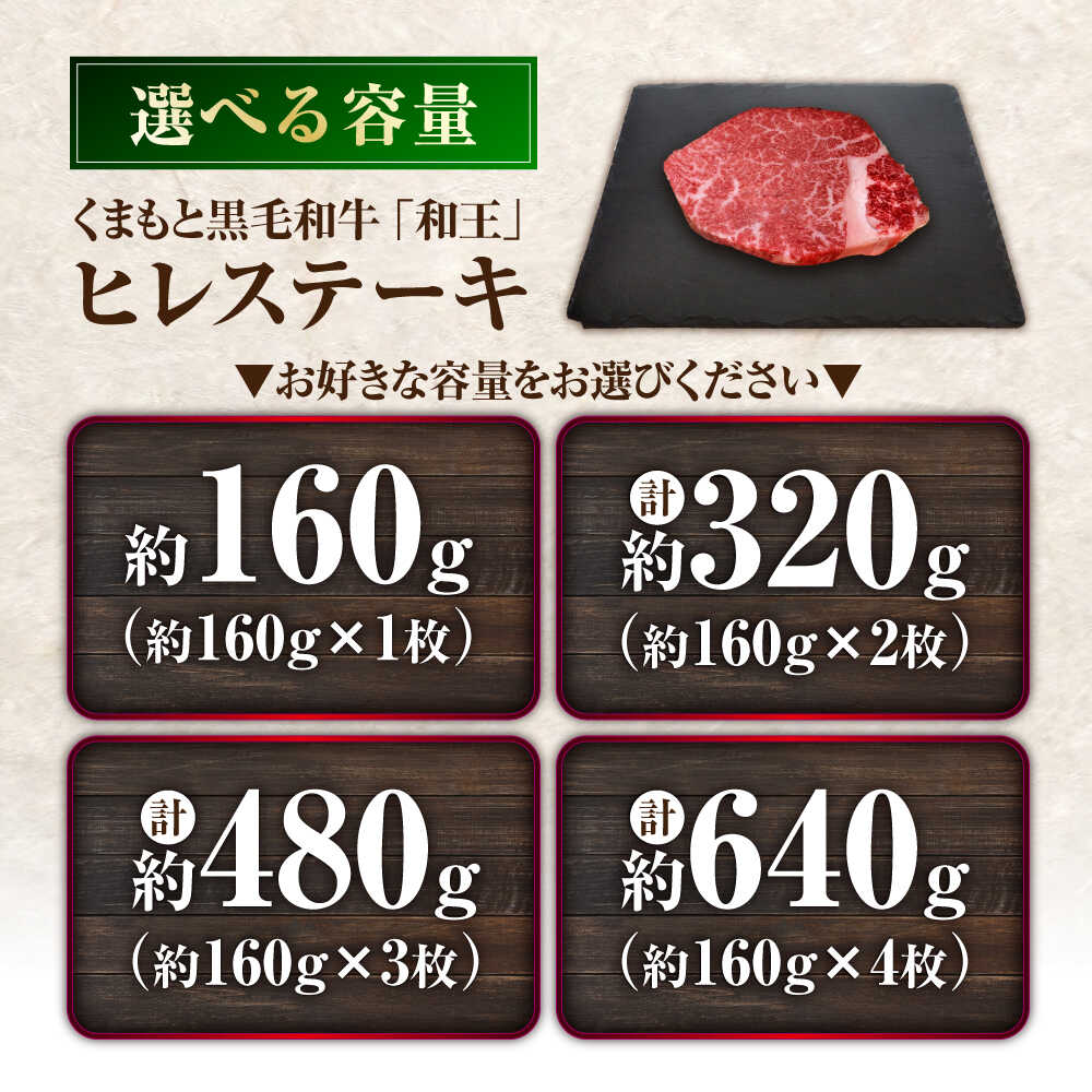 【ふるさと納税】【選べる内容量!】くまもと黒毛和牛 「和王」 ヒレステーキ 約160g~640g (約160g×1~4枚) / 牛肉 和王 黒毛和牛 肉 ヒレ ひれ 希少部位 熊本県 菊陽町【菊池地域農業協同組合】[BHBQ004]
