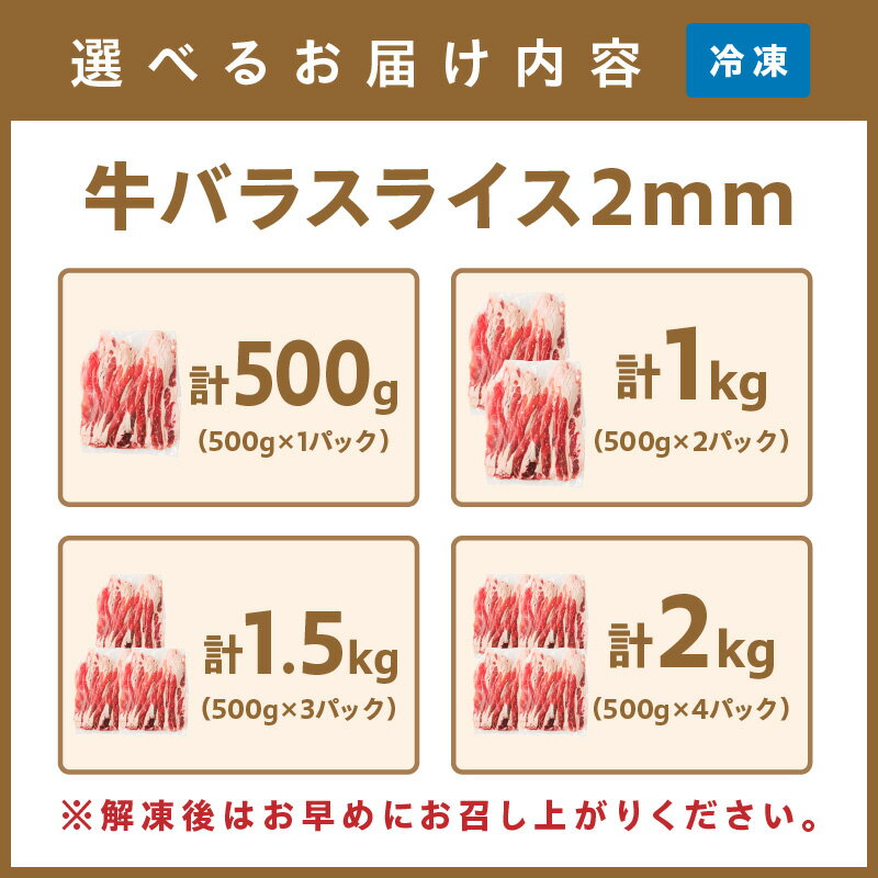 【ふるさと納税】\選べる内容量!/牛バラスライス2mm 500g 計1kg~2kg 選べる 内容量 牛 牛バラ スライス スライスカット 冷凍 牛丼 しゃぶしゃぶ プルコギ カレー 炒め物 普段使い 使い勝手 小分け 真空 ふるさと納税 牛肉 すき焼き