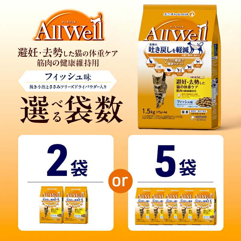 - 【ふるさと納税】AllWell 避妊・去勢した猫の体重ケア 筋肉の健康維持用 フィッシュ味 挽き小魚とささみフリーズドライパウダー入り 1.5kg 選べる袋数(2袋/5袋) ペットフード キャットフード 猫 ペット ドライ ユニ・チャーム ペット