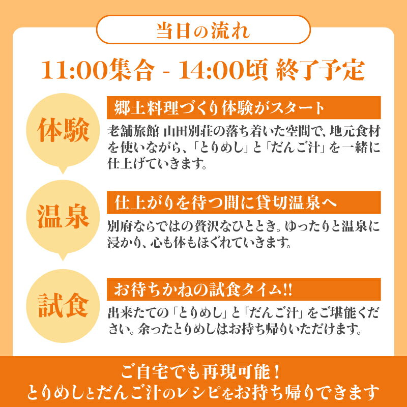- 【ふるさと納税】山田別荘 別府で郷土料理を楽しもう とりめしとだんご汁づくり体験 温泉入浴付き 観光 旅行 お出かけ トラベル 体験型 料理教室 地元名物 完全予約制 湯けむり 温泉文化 温泉スポット 老舗旅館 貸切温泉 秘湯 名湯 歴史 旅の思い出 おすすめ 大分県 別府市