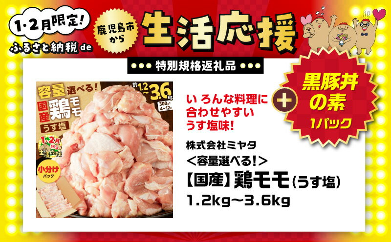 【ふるさと納税】【期間限定 生活応援】<容量選べる> 国産 鶏モモ うす塩 1.2kg 〜 3.6kg 鶏 肉 もも 味付き 下味 カット済 小分け パック からあげ 使いやすい 冷凍 一口サイズ ボリューム 大容量 真空 ミヤタ 鹿児島 鹿児島市 おすすめ ランキング プレゼント ギフト