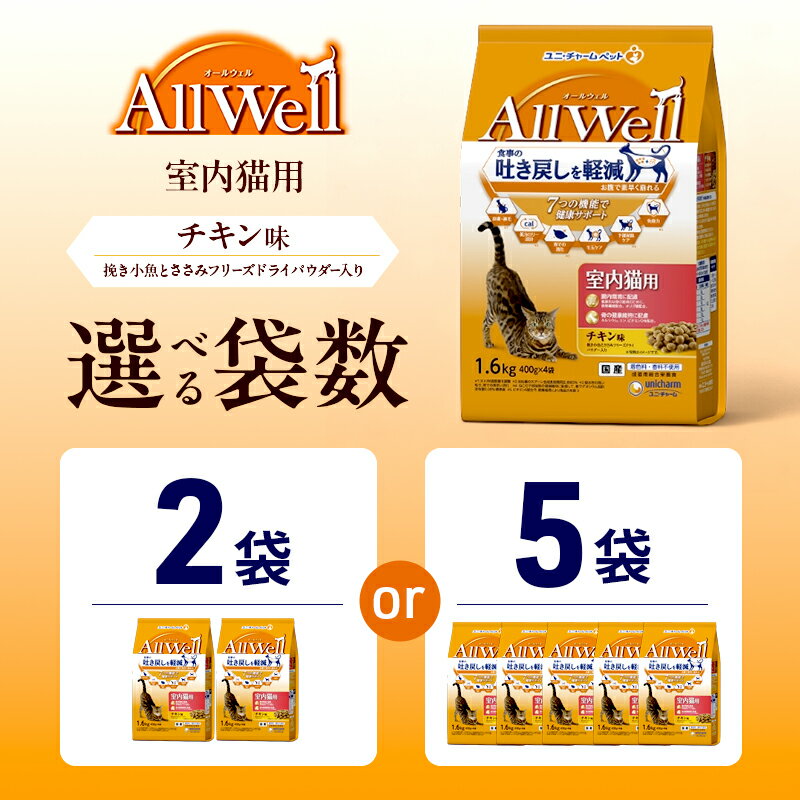 - 【ふるさと納税】AllWell 室内猫用 チキン味 挽き小魚とささみフリーズドライパウダー入り 1.6kg 選べる袋数(2袋/5袋) ペットフード キャットフード 猫のごはん 猫用フード 猫 ペット ドライ ユニ・チャーム ペット