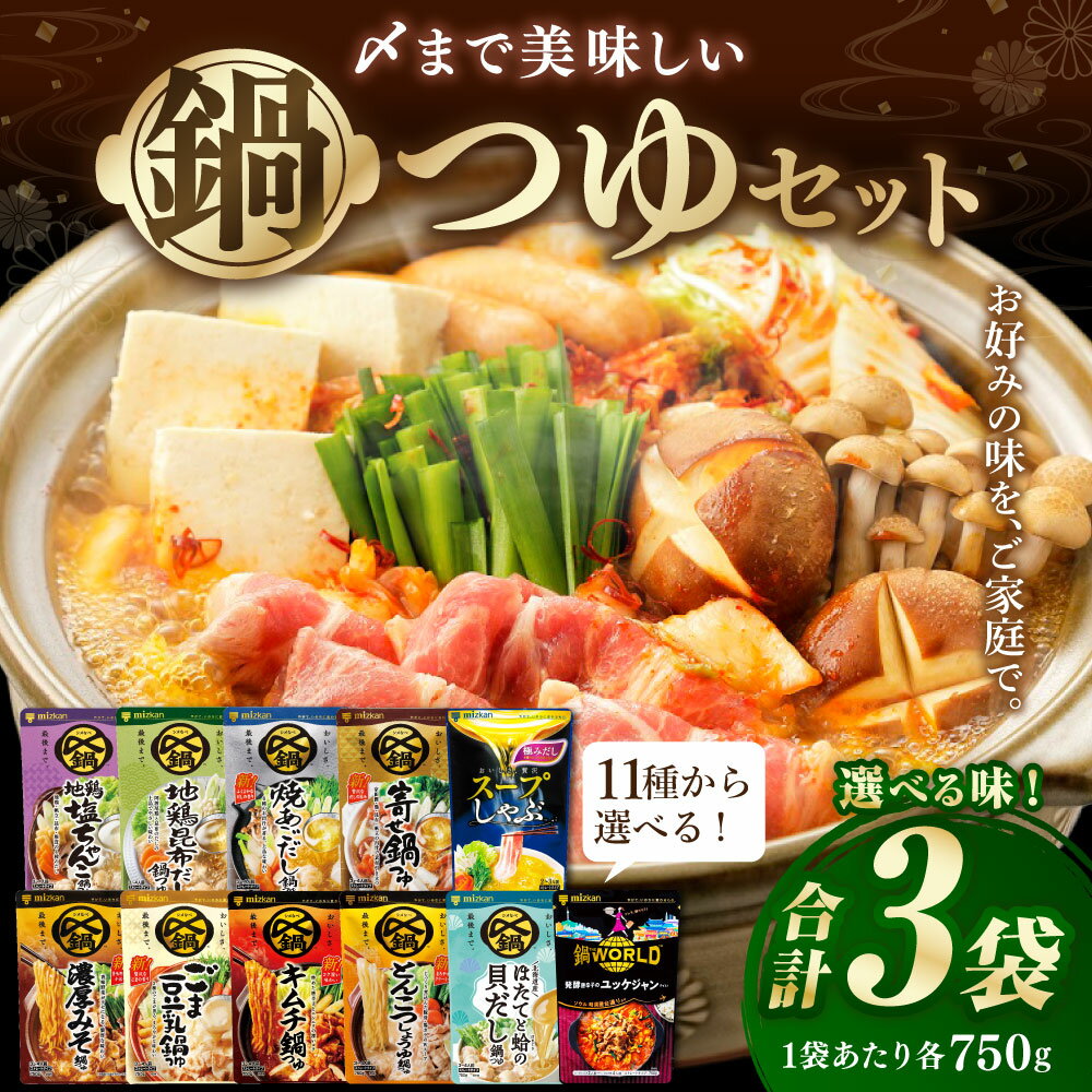 【ふるさと納税】《TVで紹介》ミツカン mizkan 〆まで美味しい 鍋つゆ 自由に選べる ( 3袋 ) セット 1袋750g 地鶏塩ちゃんこ 地鶏昆布だし 焼あごだし 寄せ鍋 濃厚みそ ごま豆乳 キムチ とんこつしょうゆ スープしゃぶ極みだし ほたて 蛤 ユッケジャン 鍋の素 お鍋 鍋