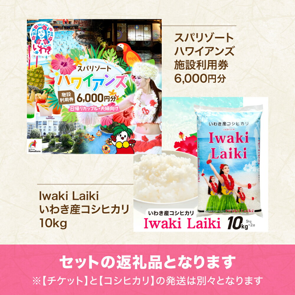 - 【ふるさと納税】スパリゾート ハワイアンズ カップル・夫婦向け日帰りプラン 施設利用券6,000円分(3,000円分×2枚)+Iwaki Laiki いわき産コシヒカリ10kg(5kg×2袋) | 利用チケット 入場券 ホテルハワイアンズ フラダンス プール 福島県 いわき市 イワキライキ | ZZ026