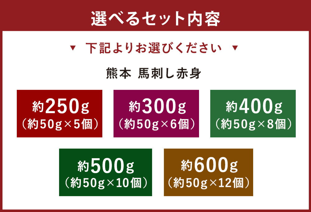 - 【ふるさと納税】<選べる内容量>熊本 馬刺し 赤身 1パック50g 計約250g(5パック) / 計約300g(6パック) / 計約400g(8パック) / 計約500g(10パック) / 計約600g(12パック) 馬刺 馬肉 お肉 低カロリー 低脂質 冷凍 熊本県 あさぎり町 送料無料