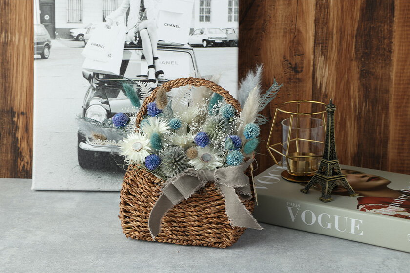 - 【ふるさと納税】バスケットアレンジ Mサイズ 縦約25cm×横約25cm×幅約15cm 青・白系 フラワーバスケット ドライフラワー デザインおまかせ フラワーアレンジ インテリア 花 合同会社クリール 《90日以内に出荷予定(土日祝除く)》送料無料 熊本県 菊池市