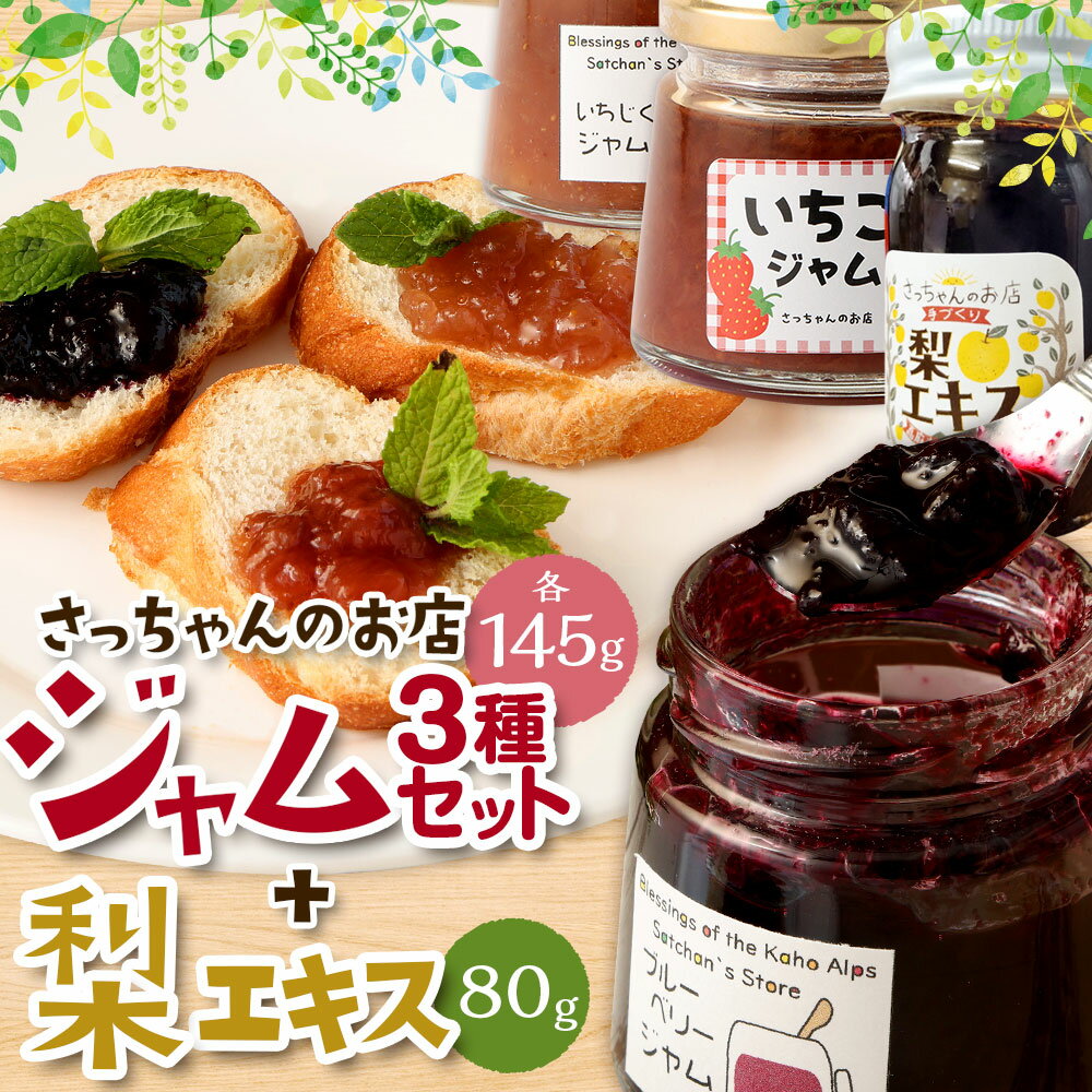 【ふるさと納税】さっちゃんの店 ジャム3種(ブルーベリー・いちじく・いちご):計435g(各145g×3本)・梨エキス(80g) 合計4本セット 計515g ジャム 手作りジャム フルーツ くだもの 果物 果汁 イチジク 無花果 イチゴ 苺 調味料 デザート 国産 福岡県産 嘉麻市 送料無料