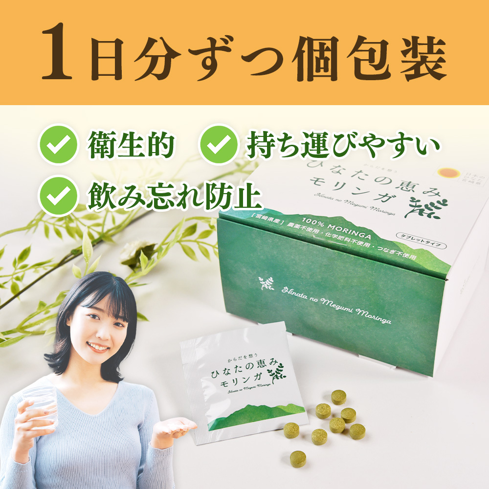 - <ひなたの恵みモリンガタブレット 2箱(1箱/8錠×30包)>持ち運びに便利な個包装 30日分 宮崎県三股町産 美容習慣 健康食品 気軽 職場 旅行 常備 つなぎ不使用 スーパーフード 国産 JAS認定工場製造 【MI730-ys】【吉原建設株式会社】