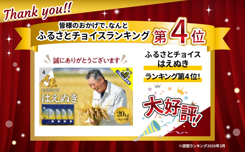 【令和8年産米】※選べる配送時期※ はえぬき20kg(5kg×2袋) 山形県産 【米comeかほく協同組合】 ka024-046d-r8