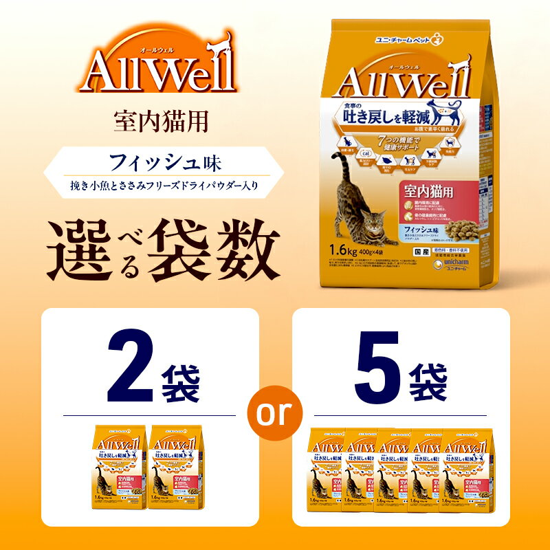 【ふるさと納税】AllWell 室内猫用 フィッシュ味 挽き小魚とささみフリーズドライパウダー入り 1.6kg 選べる袋数(2袋/5袋) ペットフード キャットフード 猫のごはん 猫用フード 猫 ペット ドライ ユニ・チャーム ペット