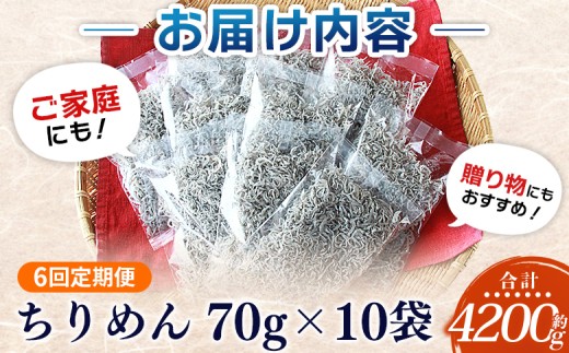 - <漁師さん自慢のちりめんじゃこ 合計700g(70g×10パック)6回定期便> しらす シラス おじゃこ お魚 おさかな 小魚 魚介類 乾燥 海の幸 海鮮 小分け 個包装 おすそ分け 国産 産地直送 送料無料 特産品 濱田水産 愛媛県 西予市【冷蔵】『お申込み月の翌月より配送を開始します。』