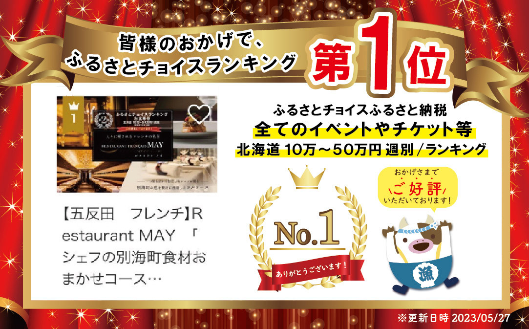 - 【チョイス限定】御礼!ランキング第1位獲得!【五反田 フレンチ】Restaurant MAY 「シェフの別海町食材おまかせコース」お食事券2名様【CC0000068】( 食事券 お食事券 食事 東京 フレンチ フランス料理 フルコース コース料理 ふるさとチョイス ふるさと納税 仕組み キャンペーン 限度額 計算 ランキング やり方 シミュレーション チョイス チョイスマイル )