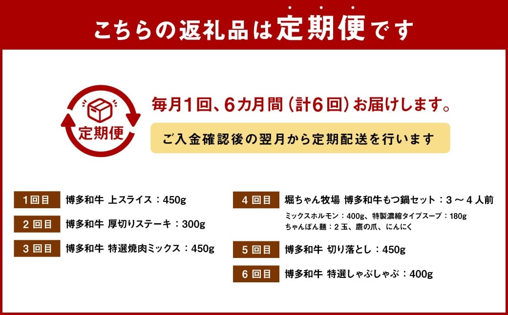 - 【 6回 定期便 】堀ちゃん牧場 博多和牛贅沢定期便 牛肉 牛 肉 にく ニク お肉 和牛 博多和牛 ロース 冷凍 国産 福岡県産 モツ鍋 もつ鍋 もつ モツ お鍋 セット ステーキ 焼肉 贅沢