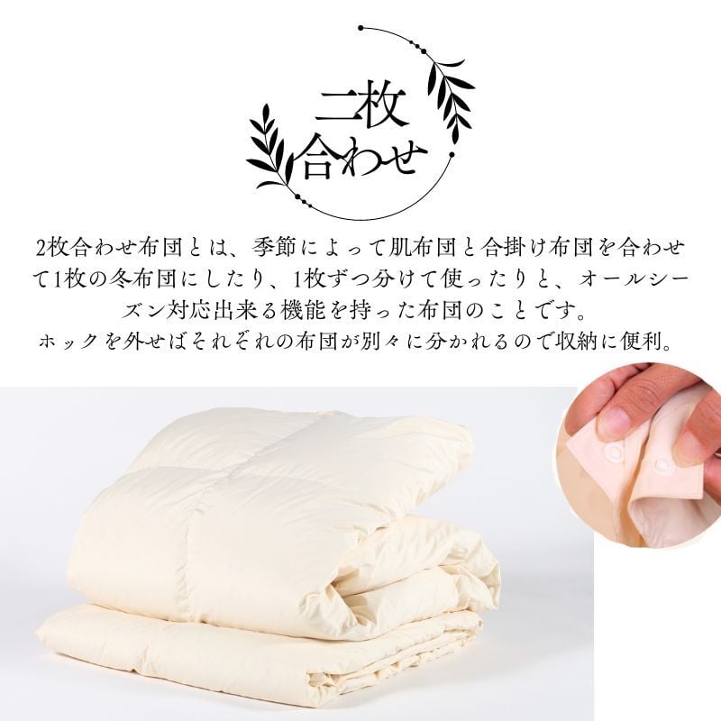- 【オールシーズン対応】最高級超長綿100% 日本製 2枚合わせ 羽毛布団 クイーン 合掛け1.6kg+肌掛け0.7kg ホック連結 ダウン93% 奈良県王寺町