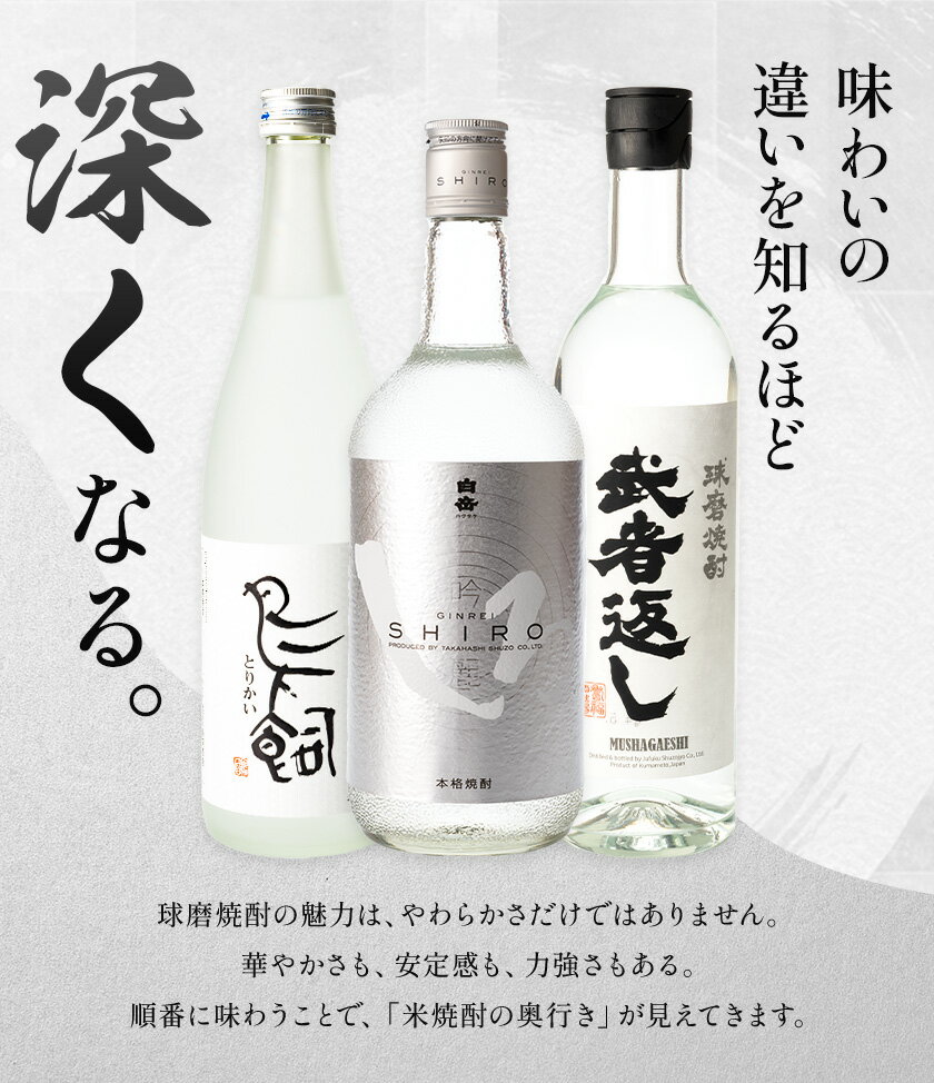 - 【ふるさと納税】定期便 球磨焼酎 厳選コース 3ヶ月 白岳 銀しろ 吟香鳥飼 武者返し 25度 720ml 1本 × 3ヶ月 計3本《お申込み翌月から出荷》熊本県 球磨郡 山江村 焼酎 酒 お酒 本格米焼酎 米焼酎 国産 熊本県産 国産米使用