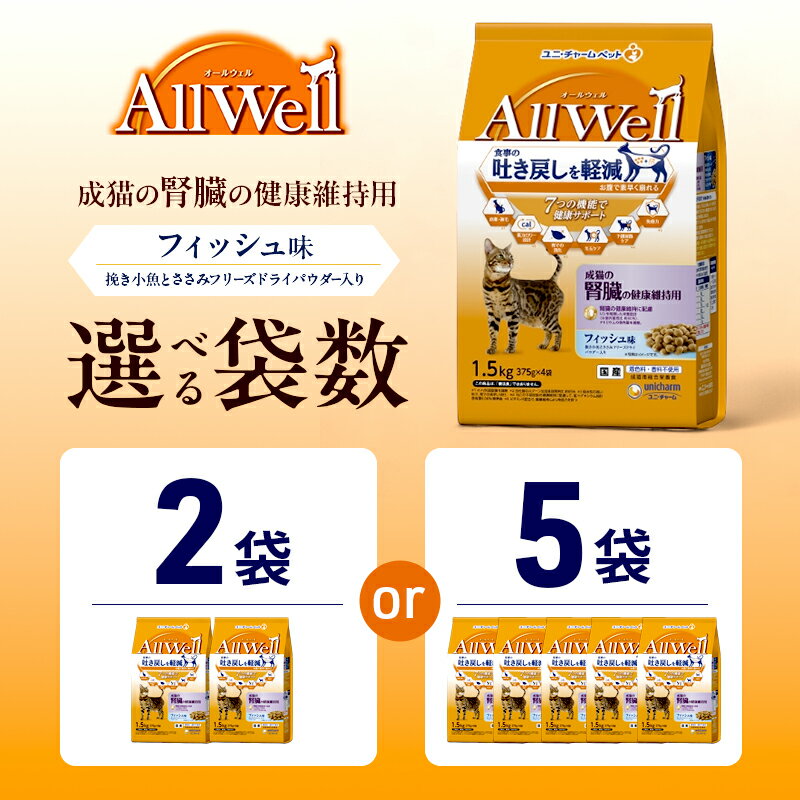 - 【ふるさと納税】AllWell 成猫の腎臓の健康維持用 フィッシュ味 挽き小魚とささみフリーズドライパウダー入り 1.5kg 選べる袋数(2袋/5袋) ペットフード キャットフード 猫のごはん 猫用フード 猫 ペット ドライ ユニ・チャーム ペット