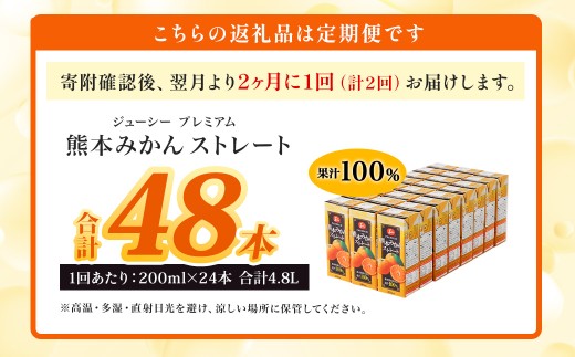 - 【2ヶ月毎2回定期便】 ジューシー プレミアム 熊本みかんストレート 100% 200ml×24本 みかん ミカン 蜜柑 ジュース みかんジュース オレンジジュース 紙パック 国産