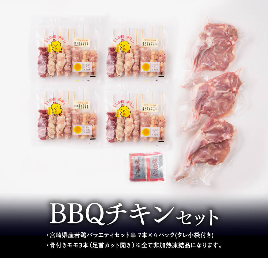 宮崎県産若鶏 BBQチキンセット(バラエティセット串7本×4P・骨付きモモ3本)タレ付き! 【 肉 鶏肉 串 骨付き バーベキュー 九州産 川南町 おうちごはん 送料無料 】