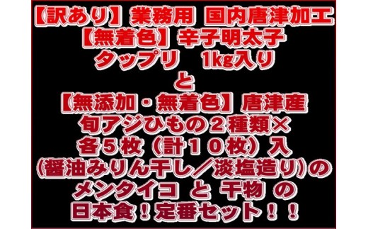 - 【無添加・無着色】手造り アジ干物セット 唐津産旬アジ開き 淡塩造り、唐津産旬アジ開き 醤油みりん干し 各5枚入セットと 国内唐津加工 無着色 明太子(メンタイコ)タップリ1kg入り のセット
