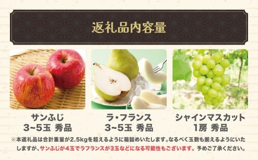 - 先行予約 山形秋果実3種満喫セット ラ・フランス サンふじ シャインマスカット 秀品 詰め合わせ 計約2.5kg 化粧箱入り 令和8年産 2026年産 ※沖縄・離島への配送不可 ns-fsrls2500