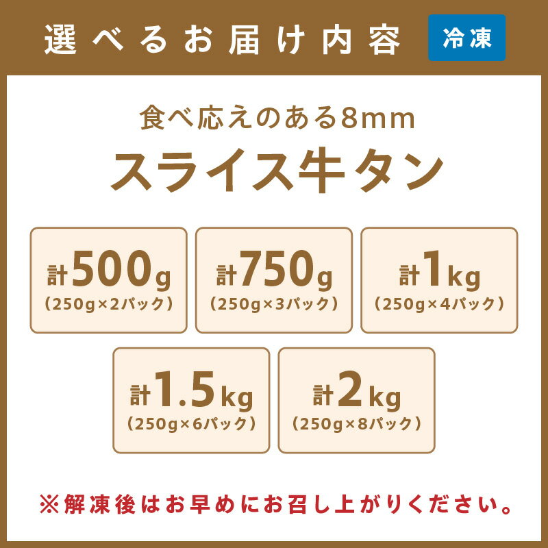 - 【ふるさと納税】\選べる内容量/食べ応えのある8mm スライス牛タン 計500g 750g 1kg 1.5kg 2kg 肉 牛 牛肉 牛タン タン スライス スライスカット 焼肉 BBQ バーベキュー 冷凍 パック おつまみ グルメ ふるさと納税 牛タン 厚切り